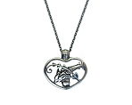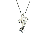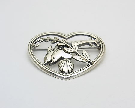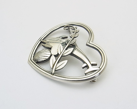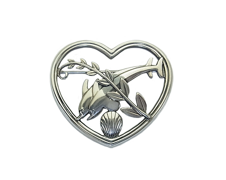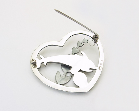 ペンダント #132A の元になったブローチです。 ファンの多い A・マリノウスキーの代表的なモティーフは、シカとイルカですが、ハワイ・コレクション と呼ばれるこちらのブローチは、2頭のイルカに貝と植物で、自然や海の豊かさを表現しております。 立体感があり、モティーフをハートで囲んだ空間が作る活き活きとした躍動感が魅力です。 |