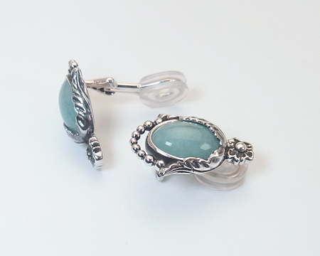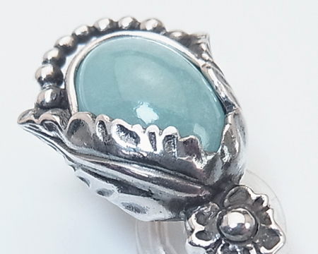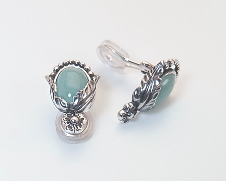 ペンダントと異なり、クリップは例年と同様のカボションのお石を覆輪留めするデザインです。 下部はシルバービーズのデザインで、上部は大小の2枚の葉でお石を留めてもいて、1997年や2010年に似ています。 トップの小花のモティーフには捻りはございません。 ブルークォーツのお色目は、小さい分ペンダントのお石より薄めです。 燻しは濃くも薄くもなく、デザインを引き立てております。 お石は天然石らしく均質ではなく、濃淡や白っぽい部分や黒っぽい部分があったり内包物も見られます。 左右のお石のコンディションには違いがございます。 お箱は通常のタイプで、栞は付いておりません。 |