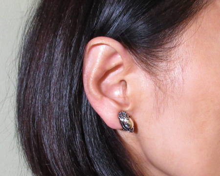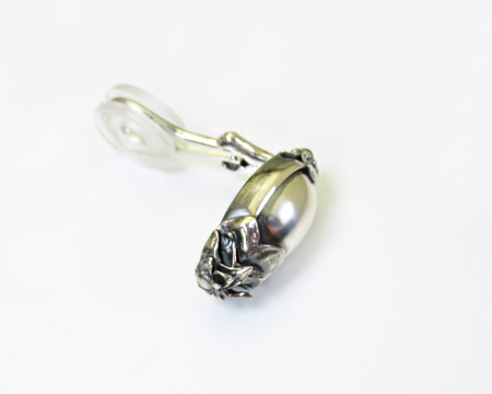 ペンダントと異なりカボションのシルバーストーンを覆輪留めするタイプです。 上下を松かさのようなデザインで留めておりまして燻しが全体的に施され、特にお石の周囲には濃くラインが入っております。 そのためオールシルバーでもギラギラすることはございません。 オーガニックなGJヘリテイジらしいデザインで、どなたにもお勧めできる品の良いクリップです。 そして、オールシルバーはお顔周りを明るくする効果がございます。 お箱は通常のタイプで、栞は付いておりません。 |