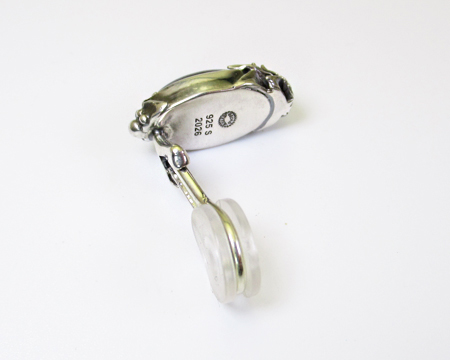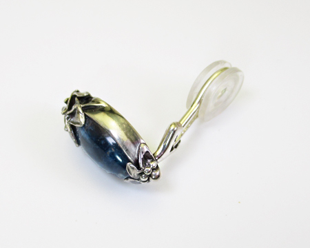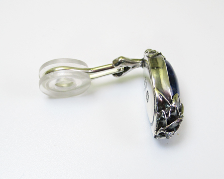 クリップはペンダントと異なりカボションの飾り石を覆輪留めしたタイプです。 丁度ペンダントを縦に分割したようで、上下を松かさのようなデザインで留めております。 また、ソーダライトの渋い雰囲気を壊さないように、シルバーには全体的に適度な燻しが施されており落ち着きを感じます。 縦長ですが2024年のクリップよりは短めですので、お耳にスッキリと沿って綺麗に収まります。 天然石ですのでお色目の違いやお色の濃淡、模様の入り方に個体差があり、従いまして左右のお石のコンディションには違いがございます。 お箱は通常のタイプで、栞は付いておりません。 |