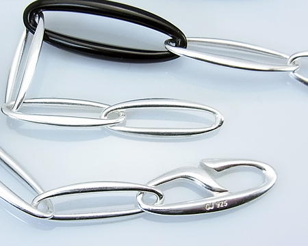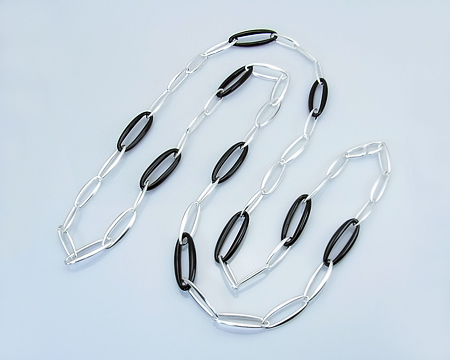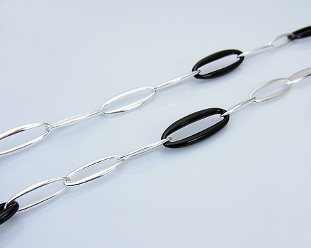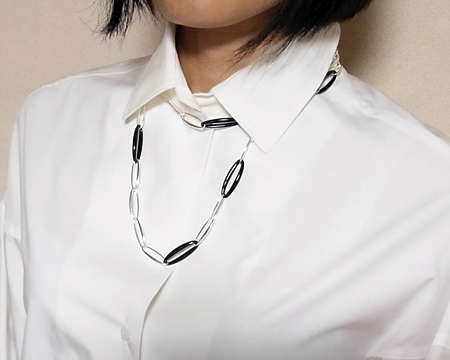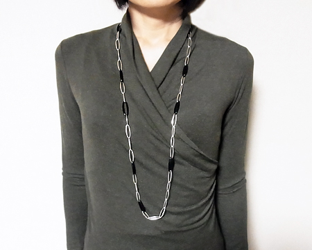 R. オバゴーの Zephyr がロングネックレスになりました。 10個のくり抜きのブラックアゲイトのピースをシルバーのピースでつなげた、スタイリッシュなソトワールです。 留め具も全体の雰囲気を壊すことのない、馴染んだデザインです。 一連のままでも、二重にして素肌の上に着けてもエレガントです。 お石には多少滑らかでない部分も見受けられます。 |
