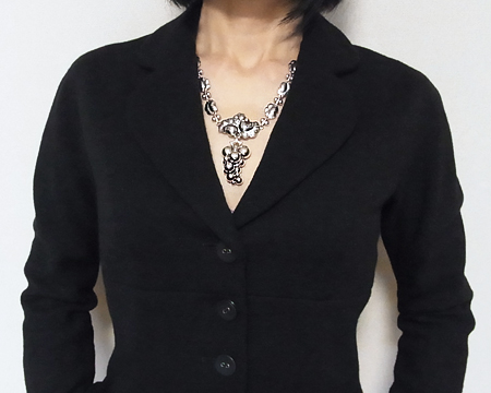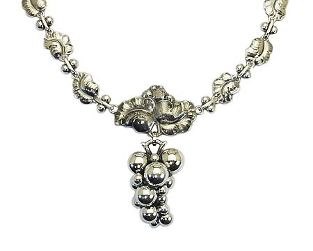 GJ を代表するクラシカルなネックレスですが、生産中止になっておりました。 H. ニールセンのブドウの房と葉のデザインが、そのまま壮大なネックレスとなっております。 細かい鎚目と濃い燻しのため、派手さや華美な印象はなく、品格のある大人の女性に相応しいお品です。 身に着ける方と一緒に年月を重ねて行くことができるジュエリーです。 |