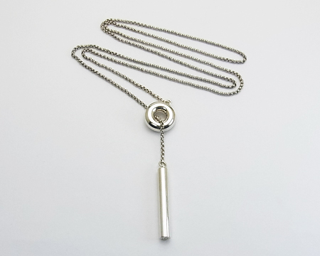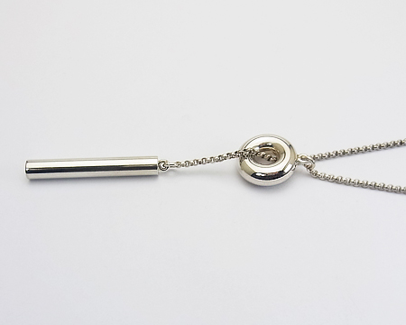 Droplet や Luna で知られる、キム バック の大胆かつ革新的なネックレスです。 GJ モダンのファンには、とても人気のあるデザインでしたが、今回 未使用のお品が見つかりました。 シリンダーをリングに通すだけなのですが、意外な安定感があり、トップスのお襟のデザインに合わせて長さを自由にアジャストすることが可能です。 |