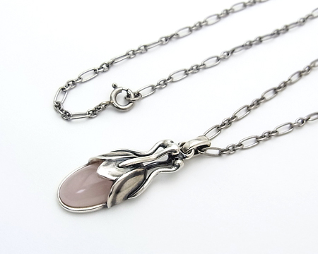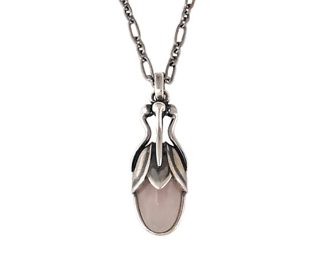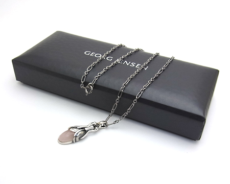 24作目となるヘリテージ コレクションも、1900年台初頭のジョージ・ジェンセンのデザインを元にしております。 お花の蕾のような優美なペンダントです。 ローズクォーツは肌馴染みが良いお石ですので、主張せず、さりげなくオシャレです。 お石は不透明ですが、今回入荷のお石は比較的均質で、当時もなかったような桜の花びらのように薄ピンクの美しいものです。 |