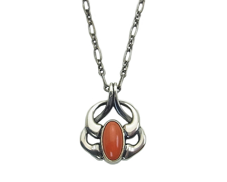 1913年に GJ ご自身によりデザインされた、お花の蕾をモティーフとしたペンダントです。 ヘリテイジではありますが、斬新でモダンな雰囲気を持っております。 2006年のお石は、シルバーストーンとオレンジムーンストーンでしたが、こちらはアジア限定のコーラルを使っております。 モモイロサンゴとしては濃いめのお色目です。 |