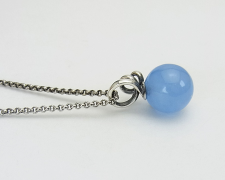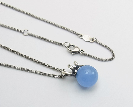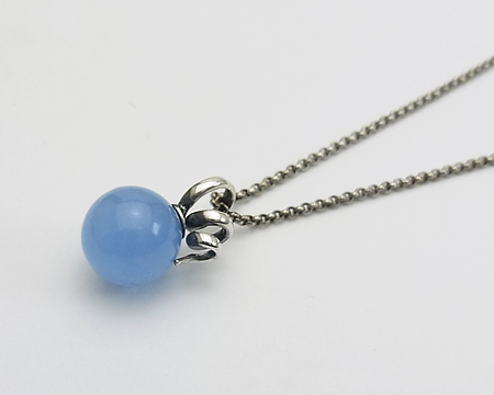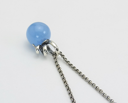 GJ、H・ニールセンのデザインが元になっております。 くるくる巻いた蔓のようなデザインが、そのままカンになっていて、そこにチェーンを通します。 お石のブルーは、白っぽい服に合わせますと鮮やかになり、濃い色の服に合わせますと渋く映ります。 デザイン部分の内側とチェーンに燻しが施されていて、クラシカルな落ち着きを感じます。 チェーンは、2cm と 5cm 短い位置でも留められます。 |