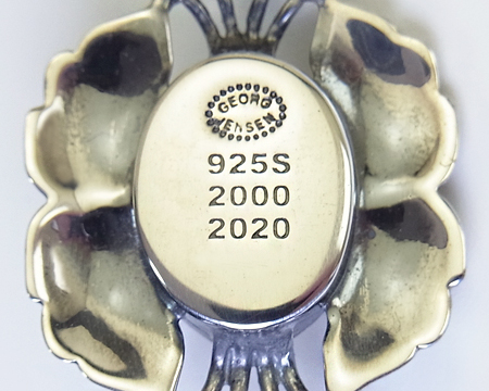 2020年に復刻された、2000年のイヤーペンダントのお石違いです。 2000年はミレニアムということで、当時としては大きなトップが特徴でした。 1909年発表の小さめなブローチがデザインの元になっております。 2000年にはシルバーストーンとヘマタイトが標準の飾り石で、ゴールド製でムーンストーン付きの限定品も販売されておりました。 復刻のこちらはピンクのお石でして、明るく華やかで優しい印象がございます。 2000と2020の刻印がありますので、2020年に成人となった方への記念のお守りにプレゼント..... などというのも素敵だなあと勝手に思ってしまいます。 |