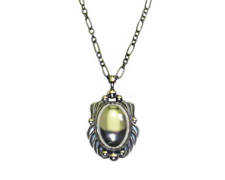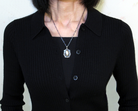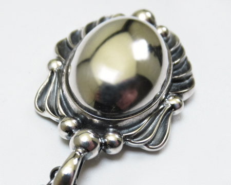2年続けて丸ごと1粒のシルバーストーンでしたが、2025年は大きなカボションのお石に戻りました。 2017年より始まった大きな飾り石はかなりな存在感と迫力があり、GJ伝統のシルバーストーンの美しさが余すところなく発揮されております。 デザインに関してですが、同じような花びらのような形を掘り下げて燻しを施したアール・デコのお品は見たことがあるのですが、2025年はどのデザインナンバーというのではなくいくつかのデザインを複合化したもののように思います。 シルバーをたっぷりと使って空間もあまり無いので、大きなシルバーストーンと燻しと相まって重厚な雰囲気がございます。 燻しは真っ黒ではなく程良くて、お石の周囲や裏側にも残されております。 こちらのデザイン性がお好きな方や、いろいろなトップスや他のジュエリーにも合わせたいという方には、オールシルバーをお勧め致します。 お箱は昨年同様に通常のもので、栞は付いておりません。 |
