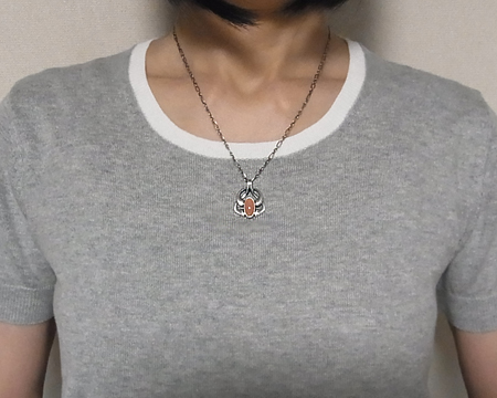 当時は Mirror にしか使われていなかった、珍しいオレンジムーンストーンです。 オレンジとは申しましても、柿色で渋さがございます。 また、透明感があり、角度により縦に1本シラーが入っているのが見える美しいお石です。 これまでにない斬新なデザインですが、要所要所に燻しが施してあり、やはりクラシカルな印象が強いです。 |