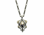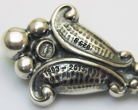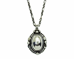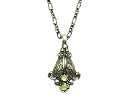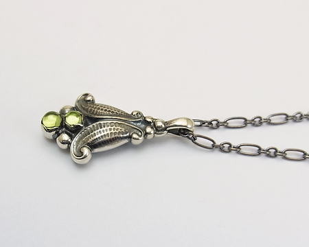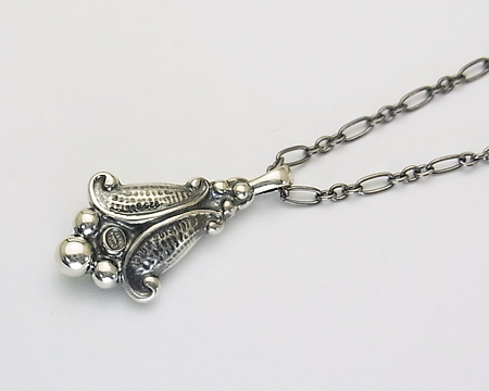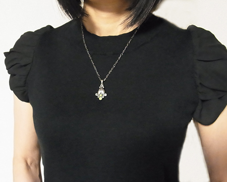 ガーネットと同様に、2013年に限定で販売された 1993年の復刻ペンダントです。 元々のアメシストやガーネットが飾り石の場合は、とてもクラシカルに見えますが、淡い黄緑が差した透明のお石のペリドットの場合は、濃い燻しの中に溶け込み、光が当たった時だけお石が輝いて、とても品の良いものです。 |