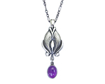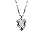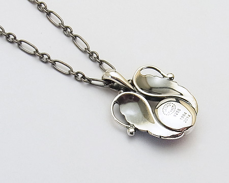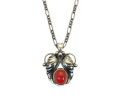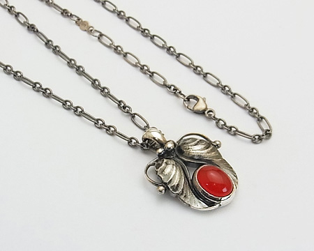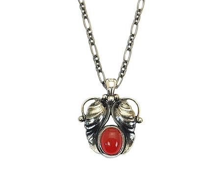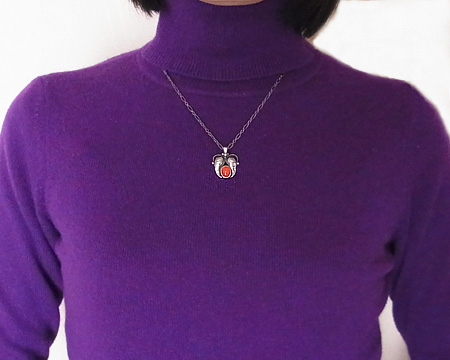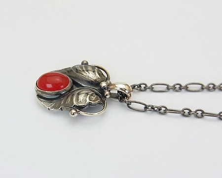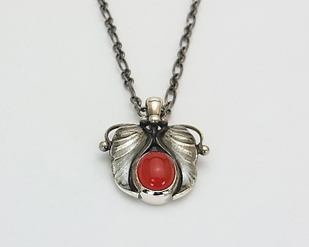 2014年に限定で復刻されたペンダントです。 お石を2枚のブドウの葉で囲み、蔓の曲線が優美な1994年のデザインをそのままに、お石はカーネリアンを使っています。 元の飾り石は光が当たると輝く渋いガーネットで、全体の印象はとてもクラシカルでしたが、こちらはオレンジ赤系で透明感のあるカーネリアンですので、燻しは濃いめですが、明るくコンテンポラリーな印象です。 |