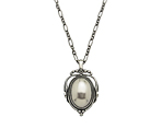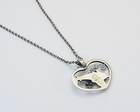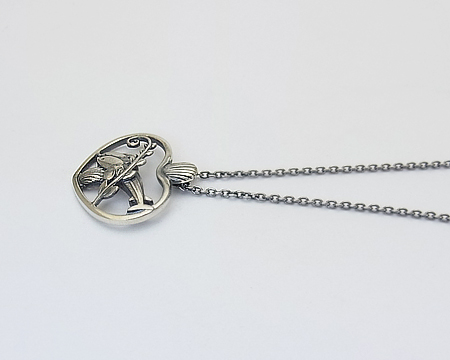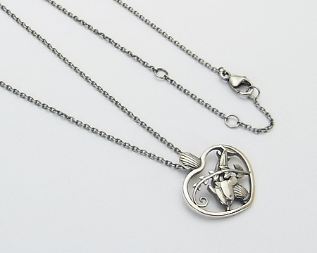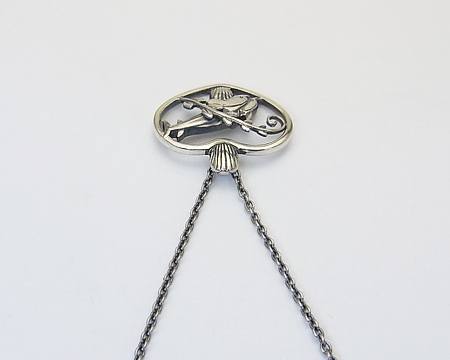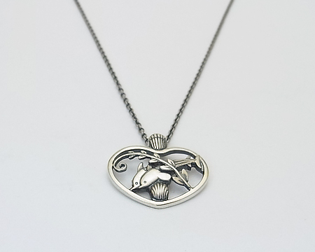 イルカに貝、植物(海草?)をハートで囲んだ、ブローチ #312 が元になったペンダントです。 カンの部分も貝でデザインされ、精巧なミニチュアを見るようです。 ジャンピング・ドルフィンのみのペンダントのような大胆さはございませんが、A・マリノウスキー ファン、ミニチュア ファンにお勧めの可愛らしく夢のあるお品です。 チェーンは2ヵ所の輪で短くお着けになれます。 |