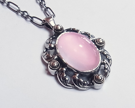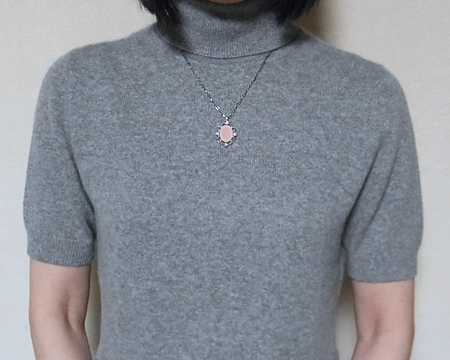 イヤーズの飾り石は、91年 ブラックアゲイト、 95年 アンバー、 97年 ラブラドライト などのイメージがございますが、2018年はどのようなお石もマッチする稀有なデザインです。 目立つ内包物の無い、ほんのり ピンクの透明なローズクォーツが留められますと、優雅で気品のあるペンダントとなります。 ブローチ ペンダント #96 でも見られますように、最近のローズクォーツは美しいものが多いです。 |
