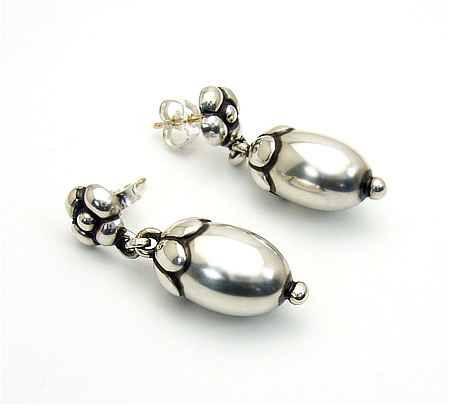 1905年のごく初期のデザインです。 数年間 生産中止となっていましたが、2010年春 待望の復刻となりましたが、また程なく作られなくなってしまいました。 ドングリのようにふっくらしたトップが揺れる、とてもクラシカルなピアスです。 オールシルバーですが、燻しが施してあるので、ピカピカせず渋く、存在感のあるお品です。 見た目よりぐっと軽い作りです。 |