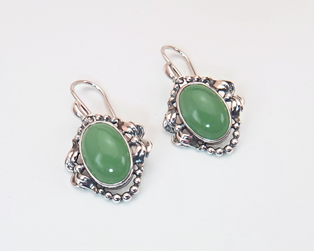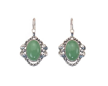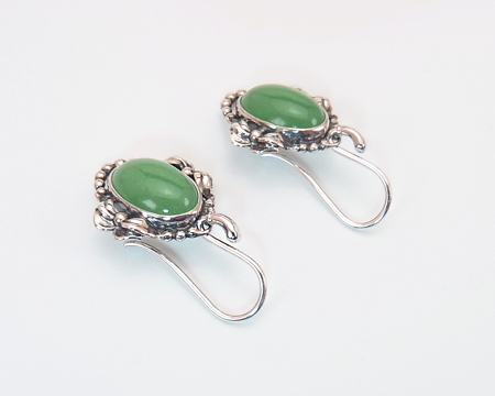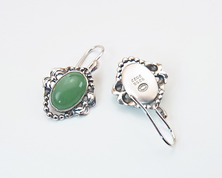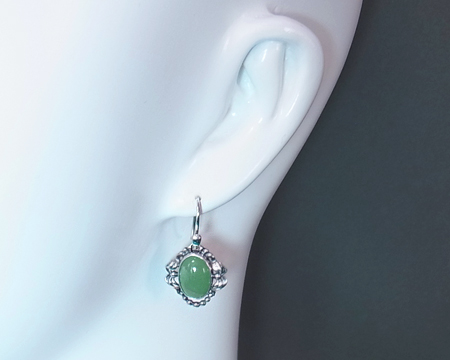 ペンダントを小さくし簡略化したデザインで、上部にフックを取り付けています。 それぞれのアヴェンチュリンのお色には、濃淡の個体差がございます。 動きにつれて揺れるイヤーフックと緑のお石があいまって、古い日本の装飾品を見ているような気も致します。 ですが、左右の月桂樹のデザインが蝶結びのリボンのように見えまして、優しく華やかな印象もございます。 お石は均質ではなく濃淡があり、内包物も見受けられます。 左右のお石のコンディションには違いがございます。 |