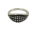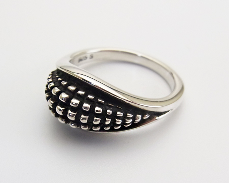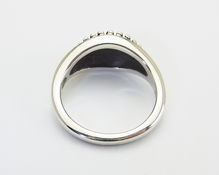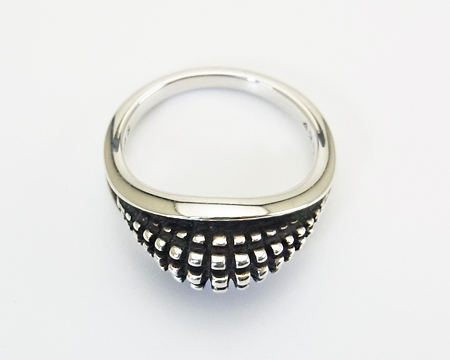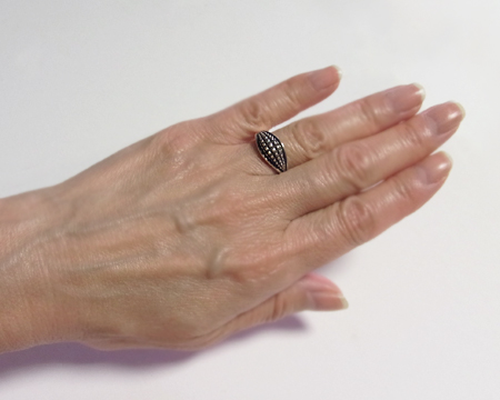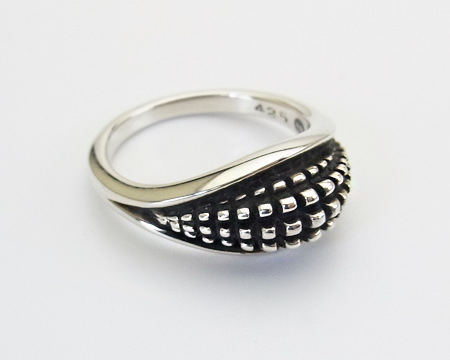 独特のデザインと非常に濃い燻しが特徴の Lene Munthe のリングです。 多種類が生産されるポピュラーなシリーズでしたが、改めて資料を調べてみましたら当ホームページを開設した2001年にはゴールドをあしらったタイプがいくつかあったのみで、オールシルバーのタイプはもう生産されておりませんでした。 モダンデザインとは言え濃い燻しがクラシカルなアイテムとも合わせ易く、GJにあっては特異な存在で、シリーズで集めていらっしゃる方も多かったです。 日本サイズ棒で測りますと13号弱ですが、裏側に空間がございますのでもう少しユルメの着け心地となります。 USED としておりますが、ほぼ未使用のとても良いコンディションです。 |