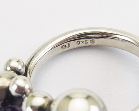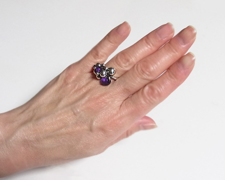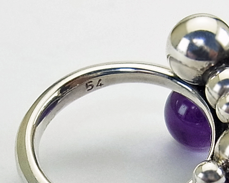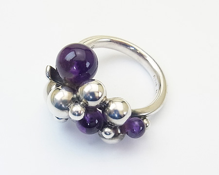 アメシストを加えたブドウのリングは、作られていた期間が長くはなかったので、やはりとてもレアなお品です。 大きくて重い Lサイズ より、着けるとなりますと Sサイズ が現実的です。 USEDですので、よく見ますとシルバーボールに2ヶ所 小さく平らになっている部分が見受けられますが、着けていて全く気になるものではございません。 こちらのリングのアメシストとしては内包物が少なく、珍しく3石が透明で美しい紫ですのでお勧め致します。 サイズは54ですが、ブドウの房が指に当たりますので、通常サイズより少しキツメの着け心地です。 |