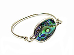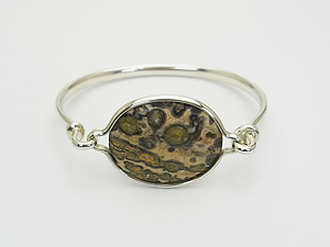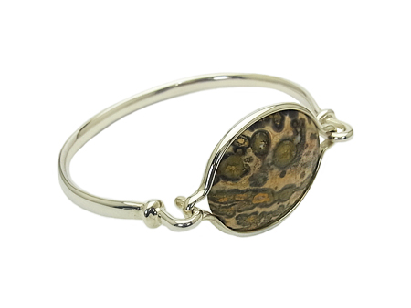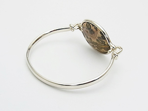 ベージュの地に、黒、茶、薄茶、黄土色、オレンジの模様がモザイクのように散りばめられた、レパードスキンのようなとても個性的なジャスピスです。 リバーシブルではなく、お石がバングルの片端に固定されていて、手首に通してからもう一方の端でお石をカチッと留めます。 Mサイズは、普通サイズの方がお着けになって、少しゆとりがある着け心地です。 |