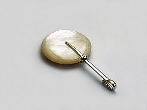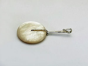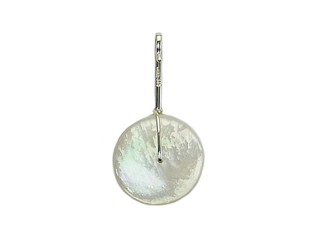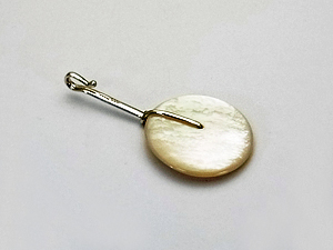 直径30mm のマザーオブパールに枠をつけず、直接中央にシルバーワイヤーを通してペンダントに仕上げました。 海が育んだ天然の貝の美しさは、Torun さん好みです。 分厚いマザーオブパールですので少しクリーム色ががって見えます。 表裏両面楽しめます。 |