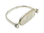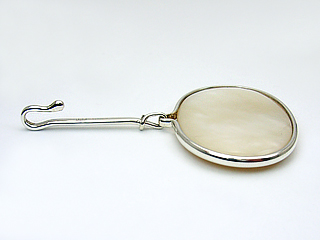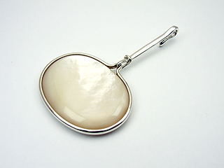 オーヴァル型のマザーオブパールをシルバーの枠で囲み、フックを付けました。 トップに動きがあるデザインです。 もちろん表裏両面楽しめます。 白いシェルはお首元を明るく見せてくれます。 |