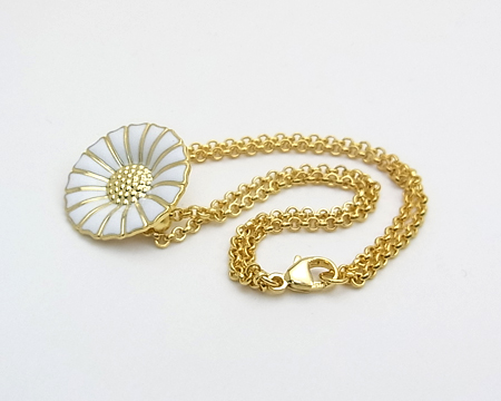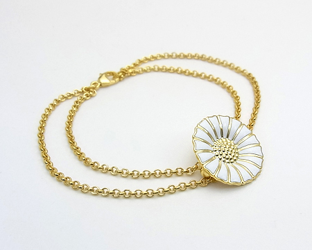 Daisy 好きがさりげなく着けられる、軽いブレスレットです。 ホワイトエナメルにゴールドの Daisy は、着ける人も見る人も明るい気持ちにさせてくれます。 チェーンが二重ですので、Daisy が裏返ることがありません。 |