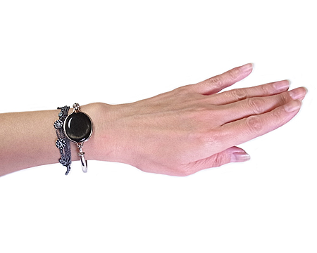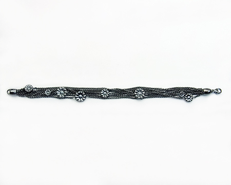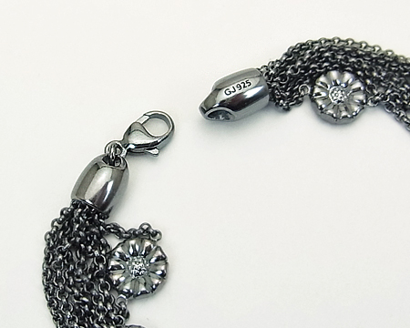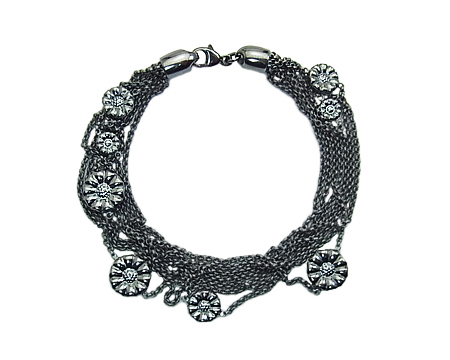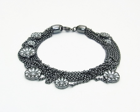 とても濃い燻しを施したヘマタイトのようなデイジーのチェーンブレスレットです。 大中小3種類のデイジー8ケが7本のチェーンにランダムに散らばっています。 濃い燻しのため、クラシカルアイテムにも合わせられます。 長さが GJ のブレスレットとしては短めの 17cm というのも嬉しいですね。 |