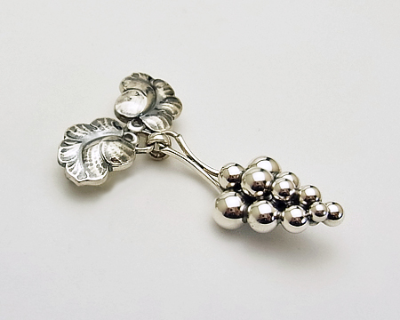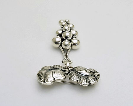 数あるデザインの中でも、GJ 以外ではこの H. ニールセンのブドウほど広く知られているモチーフはないと言えます。 ジュエリー以外で、さまざまなホロウェアも飾ってきた歴史のあるブドウです。 粒と粒の間に燻しを施すことにより一層立体感が増します。 服だけでなく、布やニットのバッグ、お帽子などにも留めてお楽しみ頂けます。