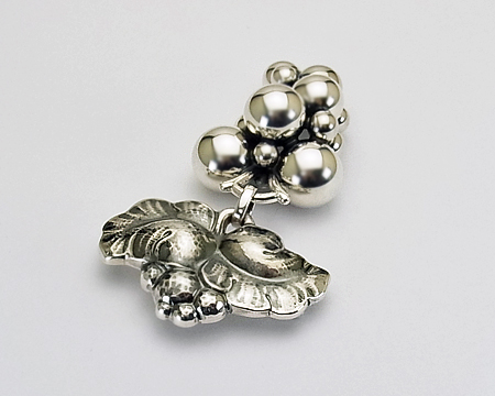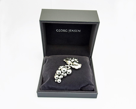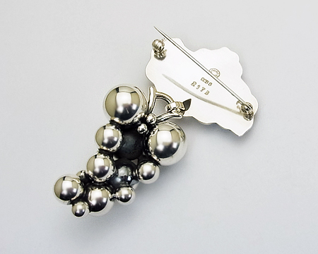 GJ ファンの方でしたら皆様ご存知の、ハラルド ニールセン の 大きなブドウのブローチが、ムーンライ ト シリーズとして お求め易いお値段で登場しました。 葉の部分の鎚目や燻しはそのままで、見た目より軽い作りです。 房の部分は 立体的な上に ブドウの粒と粒の間は燻しが施してあり、美術品のようなお品です。