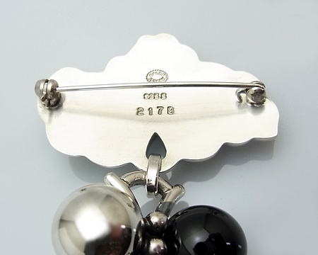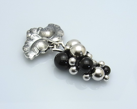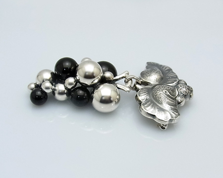 2011年秋、ブドウの大きなブローチに、ブラックアゲイトを4粒配したタイプが加わりました。 強いて言えば、全て粒がシルバーのものよりもいきいきとしてアクティブな印象です。 着用頻度はペンダントが上かもしれませんが、ピンの付いている葉の部分の鎚目や燻しがこの上なく美しく、ブドウシリーズの真骨頂と言えるアイテムです。