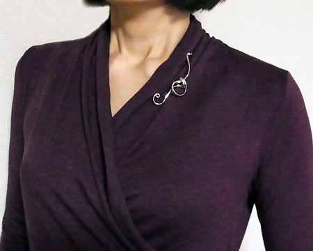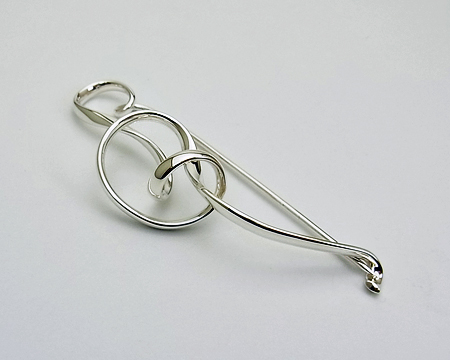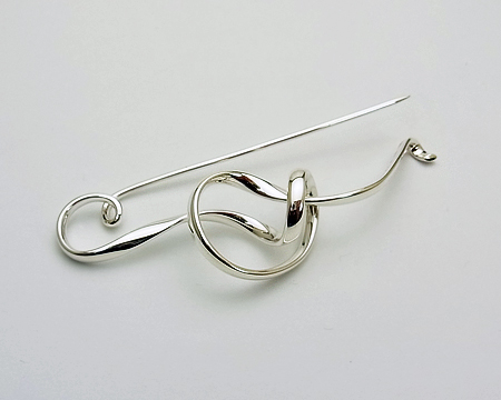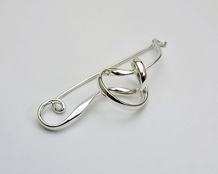 not と knot を掛けたネーミングの、1971年にデザインされた Torun さんらしいシンプルでありながら知的で深みのあるブローチです。 シルバーが 3Dの一筆描きのように、捻りを入れた美しい結び目を作っております。 留める角度により、いろいろな方向から見たフォルムの素晴らしさをお楽しみ頂けます。
