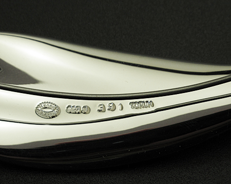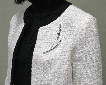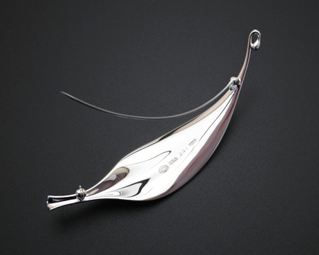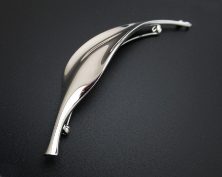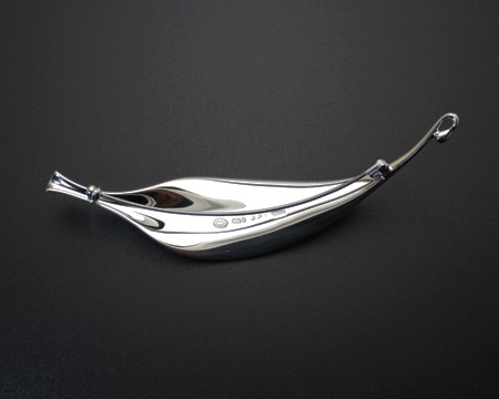GJモダンの代表的デザイナーであったヴィヴィアンナ・トールンのブローチです。 1975年の作品ですが、いつまでも古びることのない永遠のモダン・デザインです。 トールンのデザインは、自然からインスパイアされシンプルで研ぎ澄まされているのが特徴です。 たっぷりシルバーを使って美しい曲線でできているのですが、不思議と羽根の軽やかさが感じられます。 トールンのブローチと言えばメビウスのみで暫く生産されておりませんでしたが、2024年にやっと復刻されました。 ピンがカーヴしていて普通のブローチのように留めても真っすぐにはならず、斜めに傾いて羽根が舞うように美しく見える構造が、トールンらしいエスプリです。 お手持ちのチェーンをピンに通して、ヴォリュウムのあるペンダントにしても素敵です。
