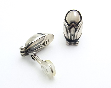 お花をイメージしたデザインは、どなたにも好まれ、また似合います。 厚みがございますが、縦長ですのでスッキリしております。 耳たぶに斜めに着けたり、下の方に着けたりと、お似合いの着け方を工夫できる楽しみもございます。 左右の燻し具合は異なっております。