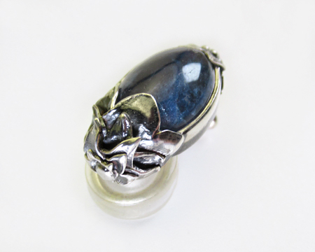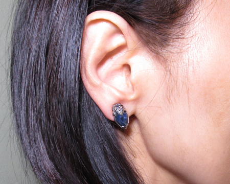 クリップはペンダントと異なりカボションの飾り石を覆輪留めしたタイプです。 丁度ペンダントを縦に分割したようで、上下を松かさのようなデザインで留めております。 また、ソーダライトの渋い雰囲気を壊さないように、シルバーには全体的に適度な燻しが施されており落ち着きを感じます。 縦長ですが2024年のクリップよりは短めですので、お耳にスッキリと沿って綺麗に収まります。 天然石ですのでお色目の違いやお色の濃淡、模様の入り方に個体差があり、従いまして左右のお石のコンディションには違いがございます。 お箱は通常のタイプで、栞は付いておりません。
