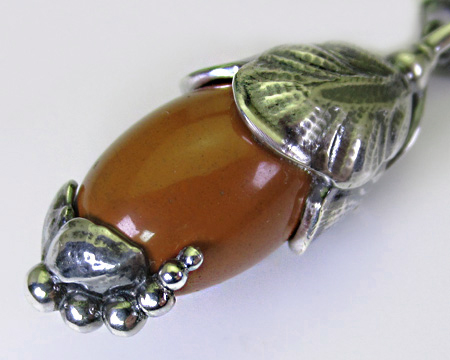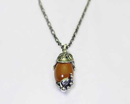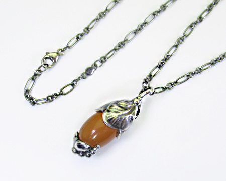 通常の飾り石はブラックオニキスですが、こちらは珍しいレッドジャスパー(ジャスピス)です。 透明感は無く艶があって少し濃淡があり、朱色と茶色の中間のようなお色目で、デザインと相まってまるでどんぐりが美しい美術品になったようです。 赤や赤茶系のカーネリアンとは異なり、ぐっと落ち着いた大人向けの渋いお色目は、紅葉の秋を思わせます。 あまりGJでは見ないお石でして、2024年のオーガニックなデザインには通常のお石ブラックオニキスより良く似合って、森からのプレゼントのように思えるシックなペンダントです。 地味でも派手でもない曖昧な魅力がお勧めのお品です。 お箱は通常のもので、栞は付いておりません。