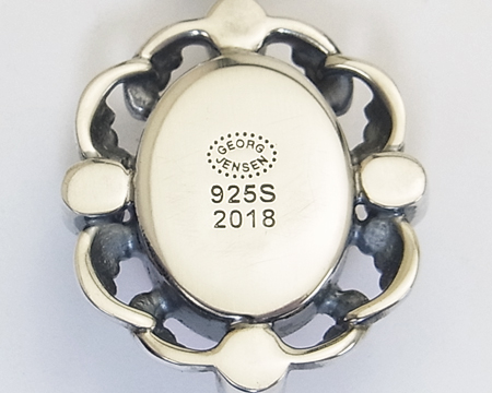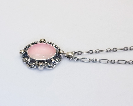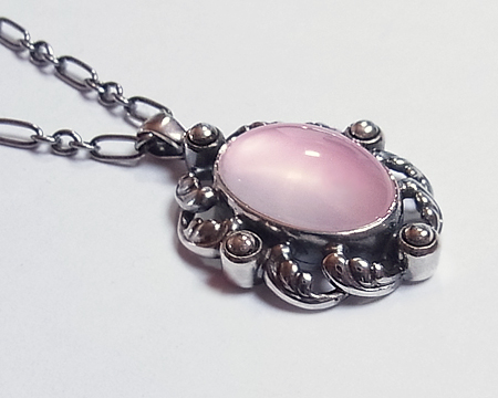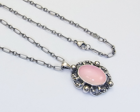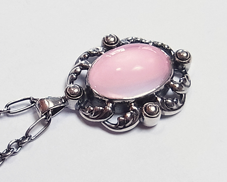 イヤーズの飾り石は、91年 ブラックアゲイト、 95年 アンバー、 97年 ラブラドライト などのイメージがございますが、2018年はどのようなお石もマッチする稀有なデザインです。 目立つ内包物の無い、ほんのり ピンクの透明なローズクォーツが留められますと、優雅で気品のあるペンダントとなります。 ブローチ ペンダント #96 でも見られますように、最近のローズクォーツは美しいものが多いです。