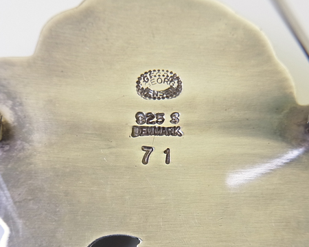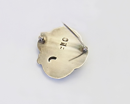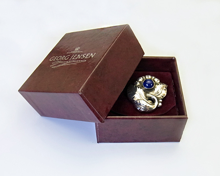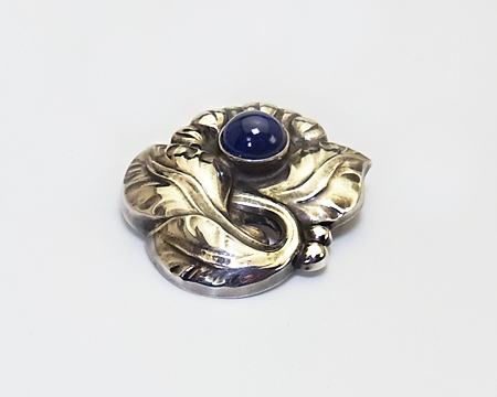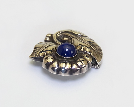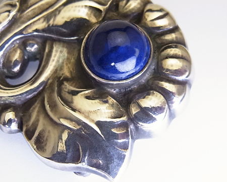 GJ工房のカタログを調べましたら、ブローチ #71 は1990年代半ばまでは、飾り石としてシルバーボール、アメシスト、グリーンアゲイトも使われておりました。 が、こちらのラピスラズリが群を抜いて高価で人気も高いものでした。 厚みがあるのに実際手にするとアレっと思う程軽い、というGJ本来の作り方をしたヴィンテイジです。 燻しは濃いままで、裏面にはスレがございますが表面とサイドにはキズが無く、大切に使われてきたことが分かります。 お石は群青というより濃藍色というのでしょうか、鉄紺に近く深い青のなかなか見ない美しいお石です。 ラピスラズリ・ファンの探し求めているお色目です。 ピンは真ん中で少しカーヴしていて、厚みのある布に留められたのかもしれませんが、全く問題はございません。 GJの大きなブローチの中では小品の部類に入りますが、普段にお着けになり易く、しかも [71] というナンバーからも分かりますように存在感のあるアールヌゥヴォーの逸品です。