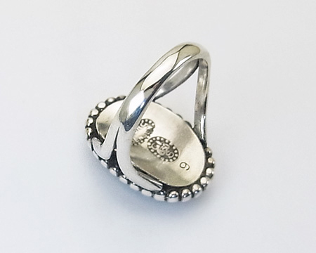 とても貴重でかつお石が美しいリングですので、まず気付いた瑕疵を先にお知らせ致します。 フクリン留めに小キズと変形があり、リングの下部に少し平坦な部分があり、周囲のドットの模様に1ヶ所燻しがとれている部分があります。 それらを全て打消してしまうのは、何よりも美しいラブラドライトです。 ただの藍色のお石のようですが、角度によりモルフォ蝶のように美しいブルーと花びらのような褐色が現れます。 幻想的で、着けていて見飽きません。 その上 カンパニーマーク、シルバー含有量の刻印から、1915年から1927年頃に生産されたお品であることが分かります。 ほぼ大正時代のリングと考えますと、いかに大切に扱われてきたのかと感慨深いです。 サイズは 53 ですが、デザイン部分が大きいので、着け心地は日本サイズで 12号 ほどです。