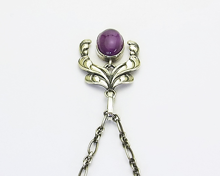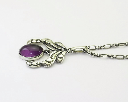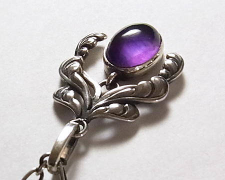 アールヌゥヴォーらしい、植物が元になった優美な曲線のデザインです。 ダングルのお石が動きにつれて揺れるのも優雅です。 アメシストは均質ではなく、濃淡があり内包物もございますが、そこがGJの天然石らしく、また半透明で妖しく見ていて飽きません。 刻印はオーヴァル・ドットですが、裏側の作りやカンの作り、お石から見まして、かなり以前に生産されたレアなお品です。 ですが表は綺麗なままで燻しも残っており、大事にされていたことが分かります。