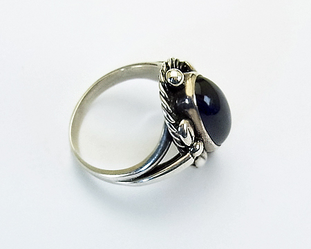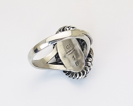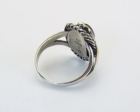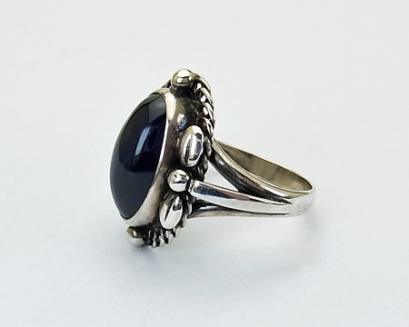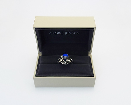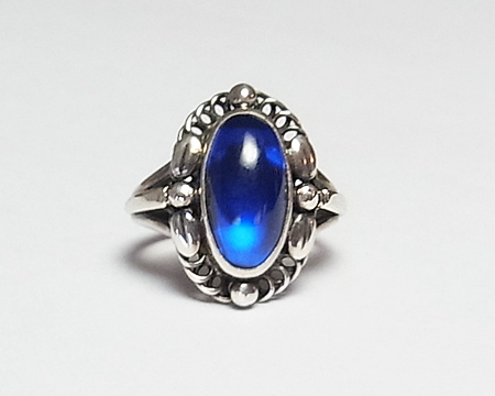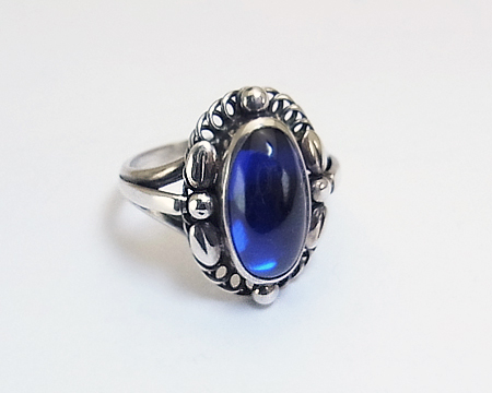 リング #1 は私の知る限り A、B、D、E が作られておりました。 デザイン部分がオーヴァルだったり、スクエアだったり、ゴールドがあしらわれる等の違いがございました。 こちらの B は縦長のオーヴァルで大変珍しいです。 飾り石も9種類ほど使われておりましたが、シンセティック サファイアは高価でした。 従いまして、こちらはとても希少なリングとなります。 艶とテリがある美しいブルーのお石で、角度により紫がかって見えることもございます。 フクリン留めも美しいままです。 よく見ますと、左右のシルバーボールにキズがございますが、刻印から考えて80年ほど前のお品となりますと、とても大切にされていたトケイ草の希少なリングと言えます。 (日本のサイズ棒で測りますと、12号です。)