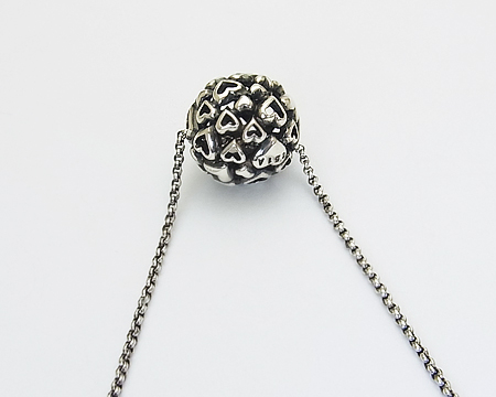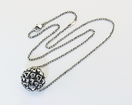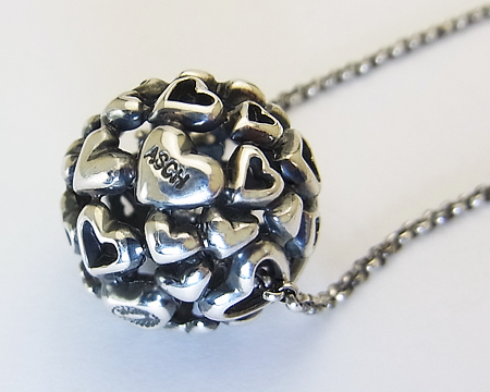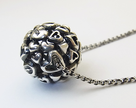 思い返してみますと、こちらは 2008年頃が最後の生産だったのではないでしょうか。 1998年のアーティスト ハート ペンダントとしてよく知られているハート・バイ・ハートは、球体や筒型のペンダントやリング、クリップ、ブローチ等の豊富な展開がございました。 数多くのハートで形作られた球体のペンダントは、手が込んでいて可愛らしく、着けていてウキウキする軽みが魅力です。 USED ですが、全く使用感はございません。