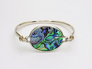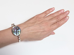 変化に富んだ パウア貝 と表情のある マザーオブパール の両方をお楽しみ頂けるリバーシブルタイプです。 シンプルなデザインですので、どなたにも似合います。 Mサイズは、普通サイズの方がお着けになって、少しゆとりがある着け心地です。